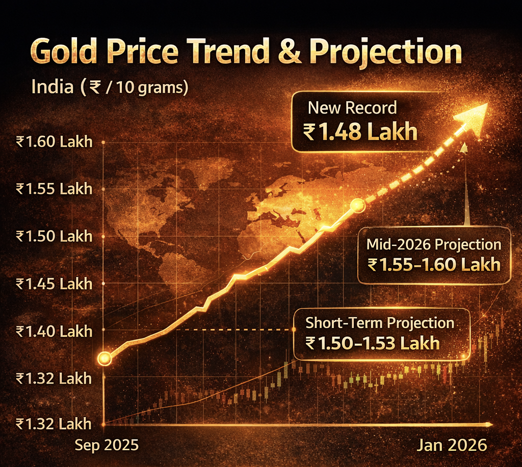 Gold prices have been consistently rising since Sep 2025, moving from around ₹1.32 lakh to ₹1.48 lakh per 10 grams by January 2026.